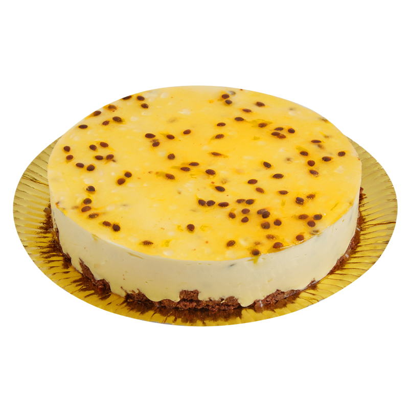 Bizcocho brownie con nueces, mousse de maracuyá, cubierta con reducción de maracuyá.
