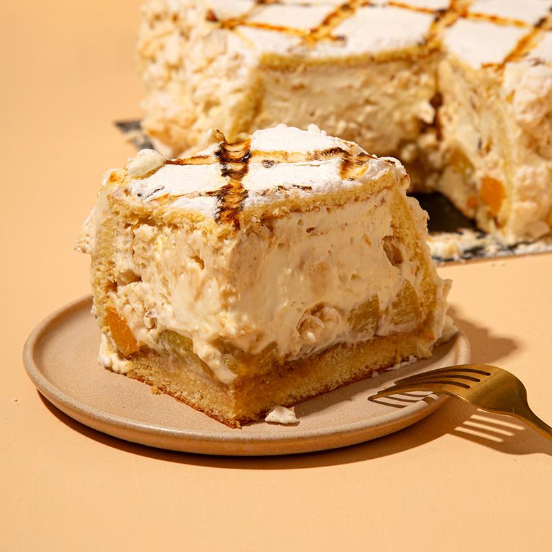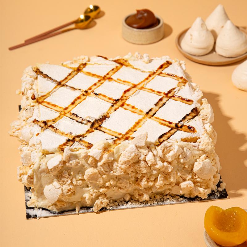 Bizcochuelo de vainilla, dulce de leche, duraznos, crema chantilly, trozos de merengue.