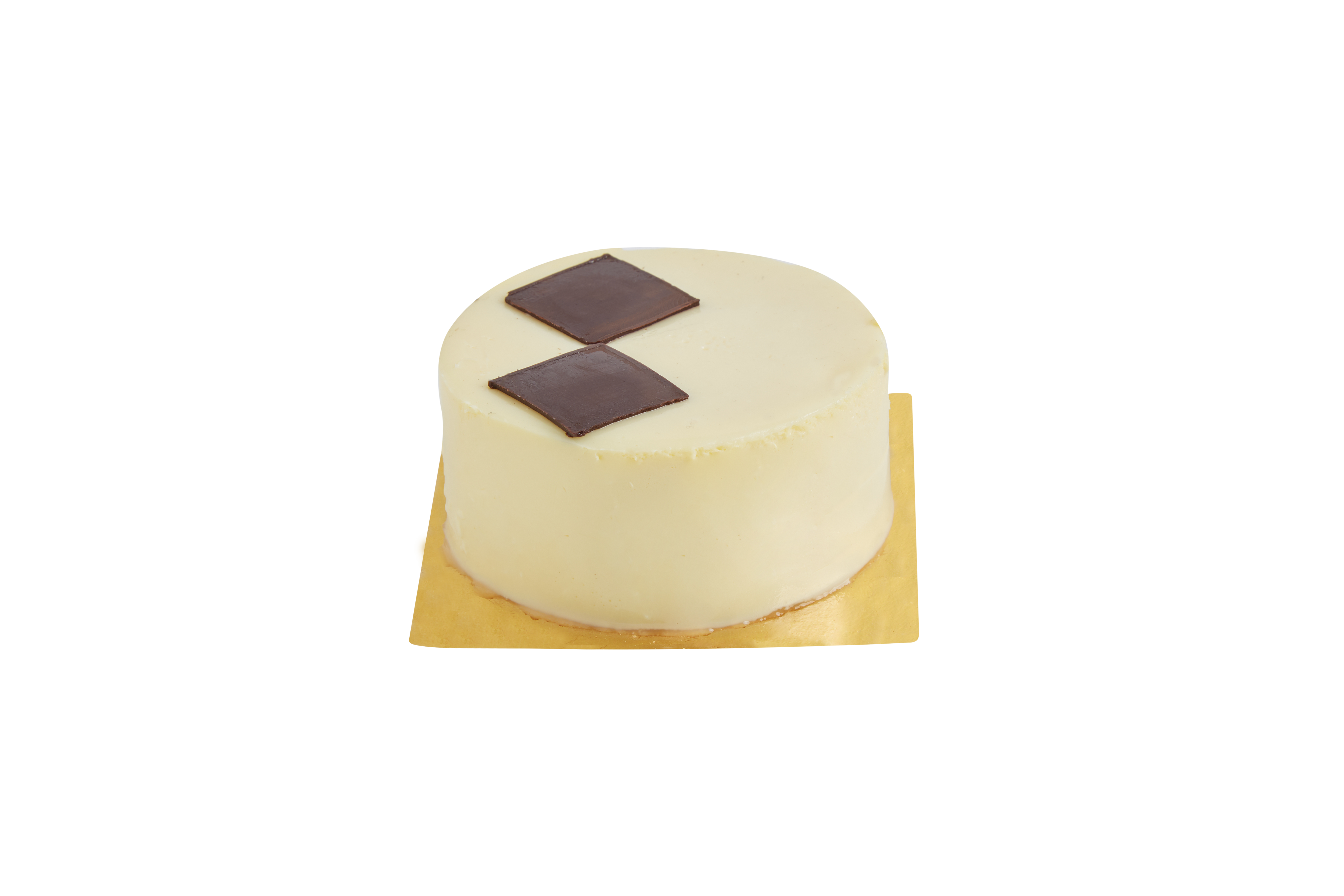 Mousse de chocolate blanco con un interior cremoso de maracuya. En la base tiene un dacquoise de coco.