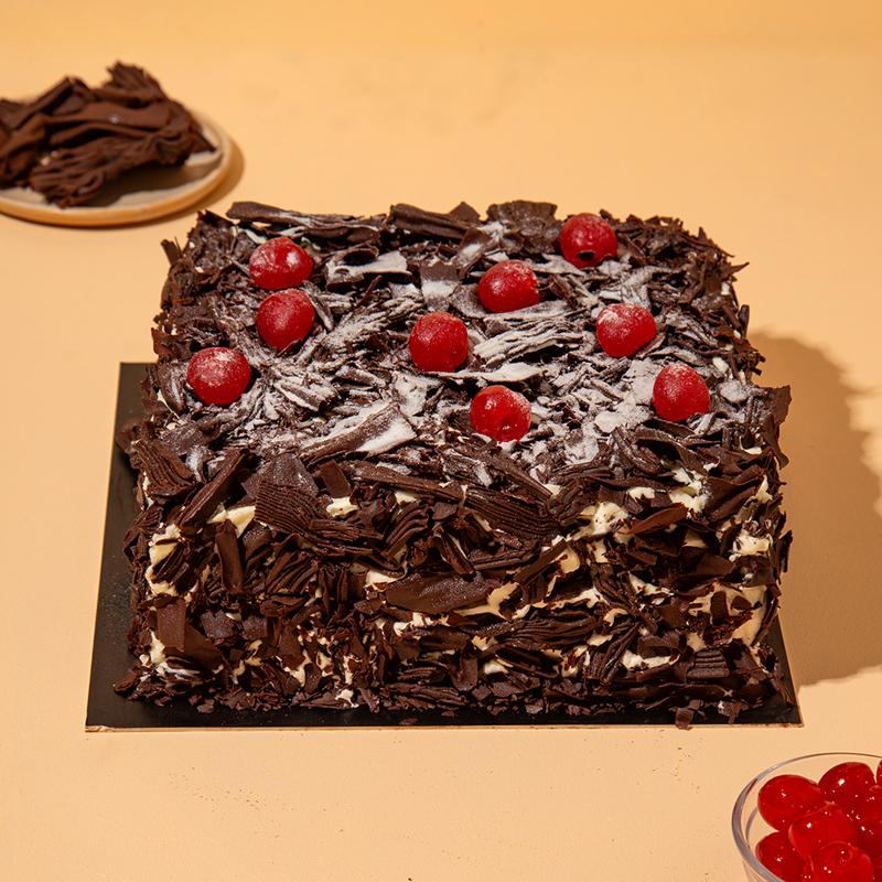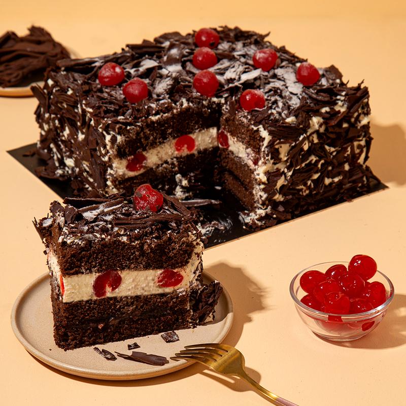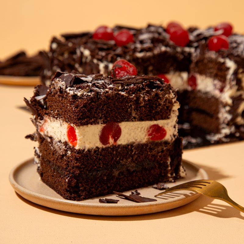 Bizcochuelo de chocolate con dos cortes. Uno con crema chantilly y cerezas al marrasquino; y el otro corte con dulce de frambuesas. Humedecida con almíbar de cerezas.